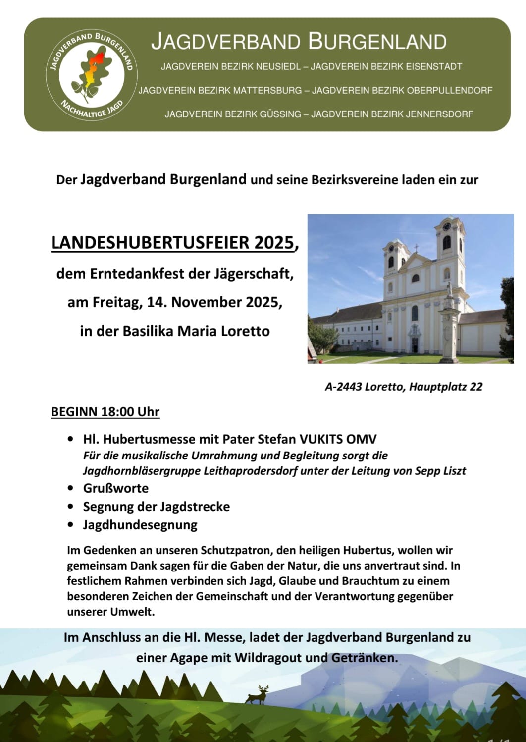 Der Jagdverband Burgenland und die dazugehörigen Bezirksvereine laden zur LANDESHUBERTUSFEIER 2024, dem Erntedankfest der Jägerschaft,am Freitag, 15. November 2024,in die Basilika Maria Loretto ein. A-2443 Loretto, Hauptplatz 22 BEGINN 18:00 Uhr Im Anschluss an die Hl. Messe, lädt der Jagdverband Burgenland zueiner Agape mit Wildragout und Getränken ein. Hier ist die Einladung als PDF zum […]