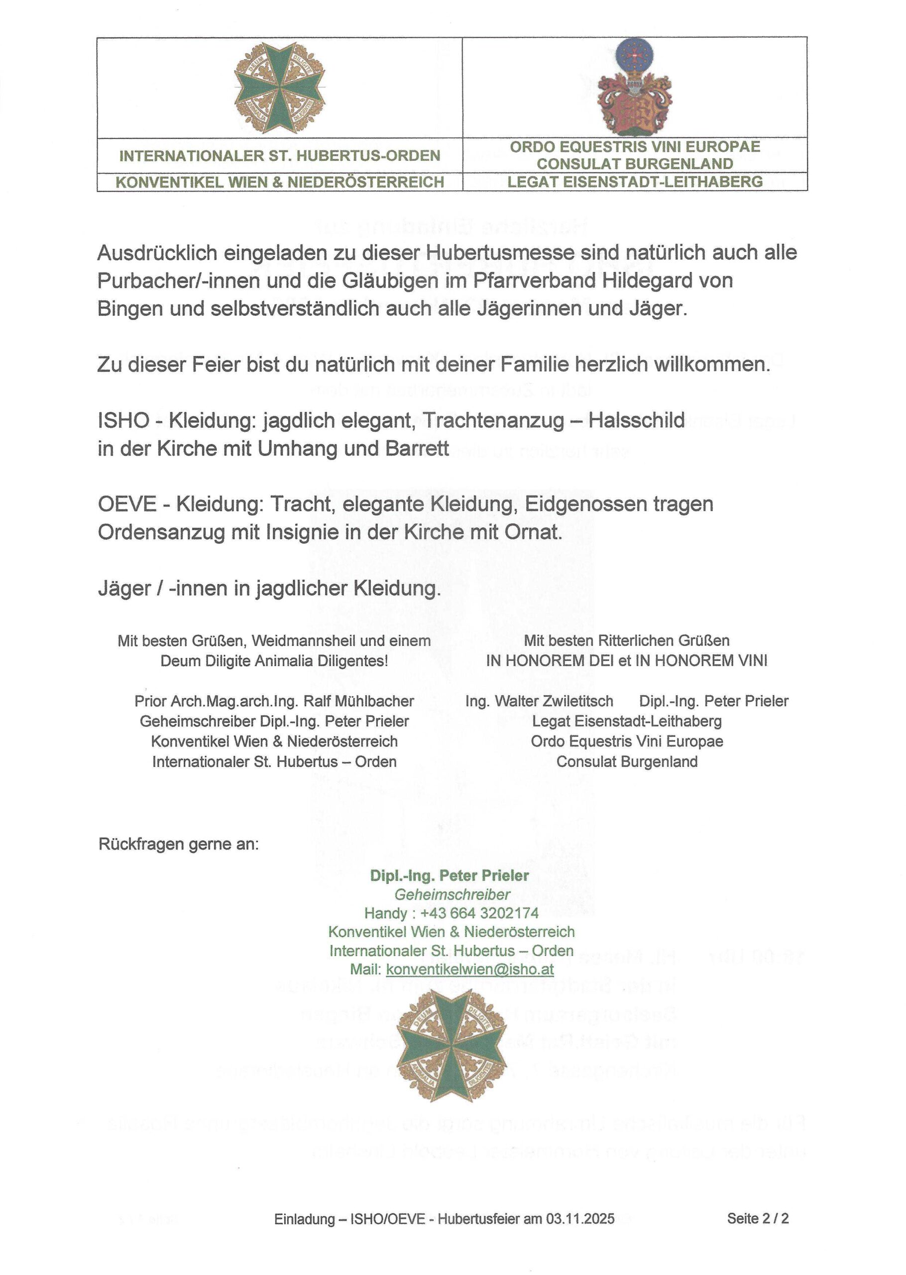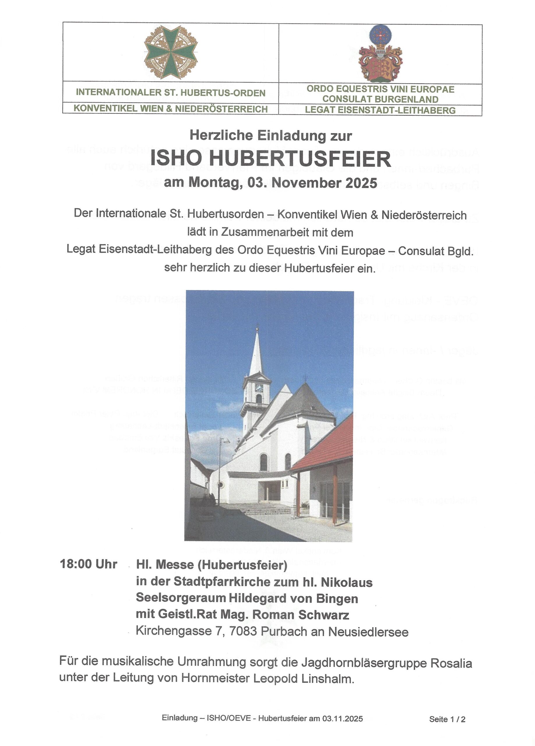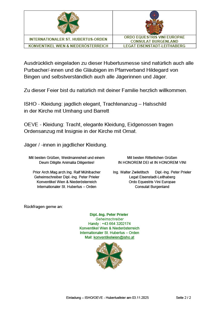 Der Internationale St. Hubertusorden – Konventikel Wien & Niederösterreich lädt in Zusammenarbeit mit dem Weinritterorden Legat Eisenstadt-Leithaberg sehr herzlich zu dieser Hubertusfeier in die Stadtpfarrkirche zum hl. Nikolaus Seelsorgeraum Hildegard von Bingen, Purbach am Neusiedlersee mit Geistl. Rat Mag. Roman Schwarz ein.