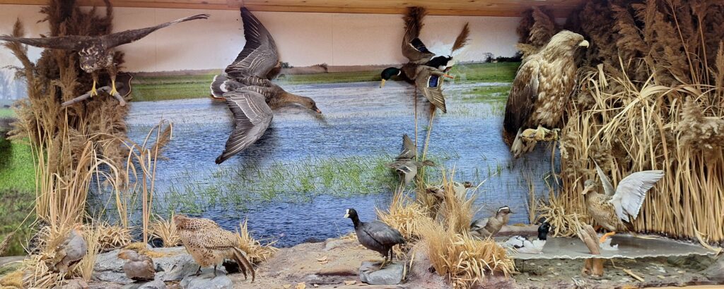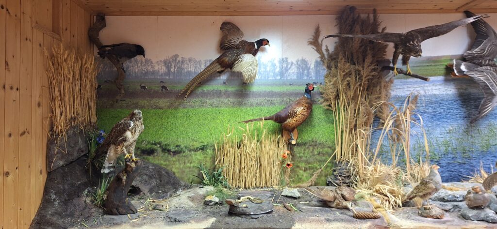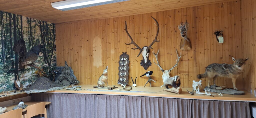 mit Stopfpräparaten der dazugehörigen Tierarten, sowie Trophäen von heimischen Wildarten. Als Besonderheit ein Präparat eines von einen LKW bei einem Verkehrsunfall zwischen Donnerskirchen und Purbach aus dem Mutterleib gerissenen Rotwildkalbes, sowie das Stopfpräparat eines der letzten im Bezirk Neusiedl am See erlegten Trapphahns