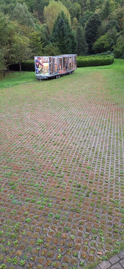 Die naturangepasste Gestaltung des Platzes vor dem Gebäude erfolgte durch Verlegung von Rasengittersteinen durch die Firma Leier.