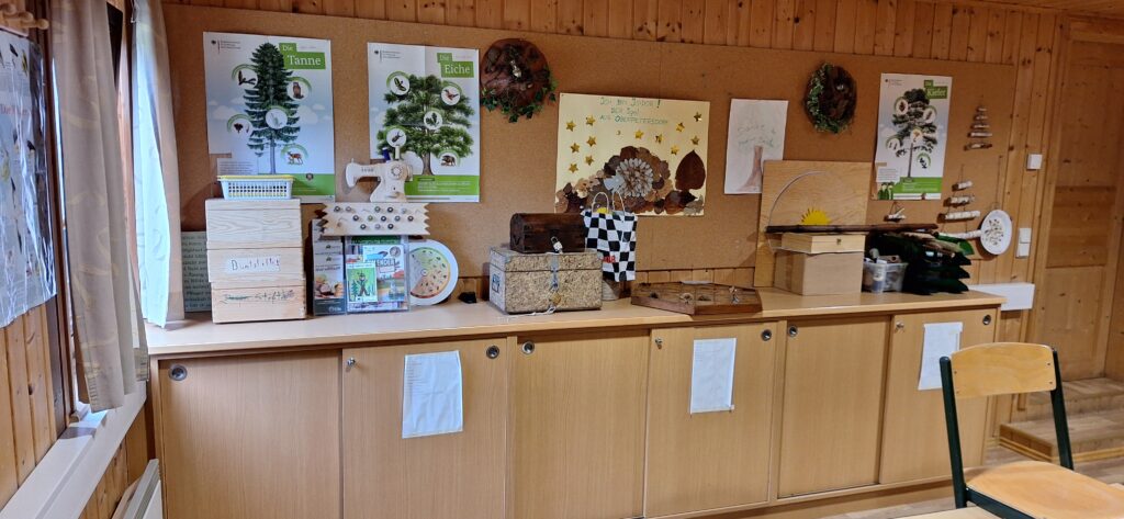Nach diesen Vorgaben wurde im Jahre 2001 mit der Umsetzung begonnen, wobei neben den baulichen Vorhaben vor allem die Gestaltung der Themenbereiche im Freigelände eine besondere Herausforderung war. Anregungen hierzu konnte ich durch Besuchen der Waldschule Wien, der Waldschule im Mecsek Gebirge, Forstdirektion Pecs, Ungarn, der Waldschule Linz, Landesforstdirektion Oberösterreich, bei ähnlichen Einrichtungen eines privaten Waldbesitzers in der Steiermark, aus Literaturunterlagen und Vorschlägen interessierter Personen sammeln. Im Gebäude und im Freigelände wurden dargestellt: