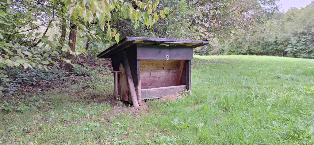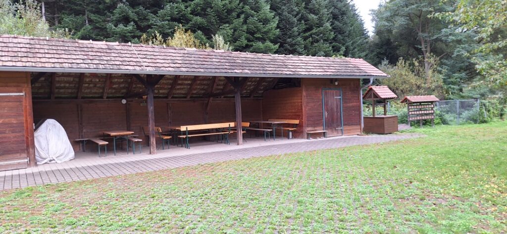 1 WC, überdachte Unterstellmöglichkeit für Geräte und Sitzmöglichkeit für Schulungsteilnehmer.